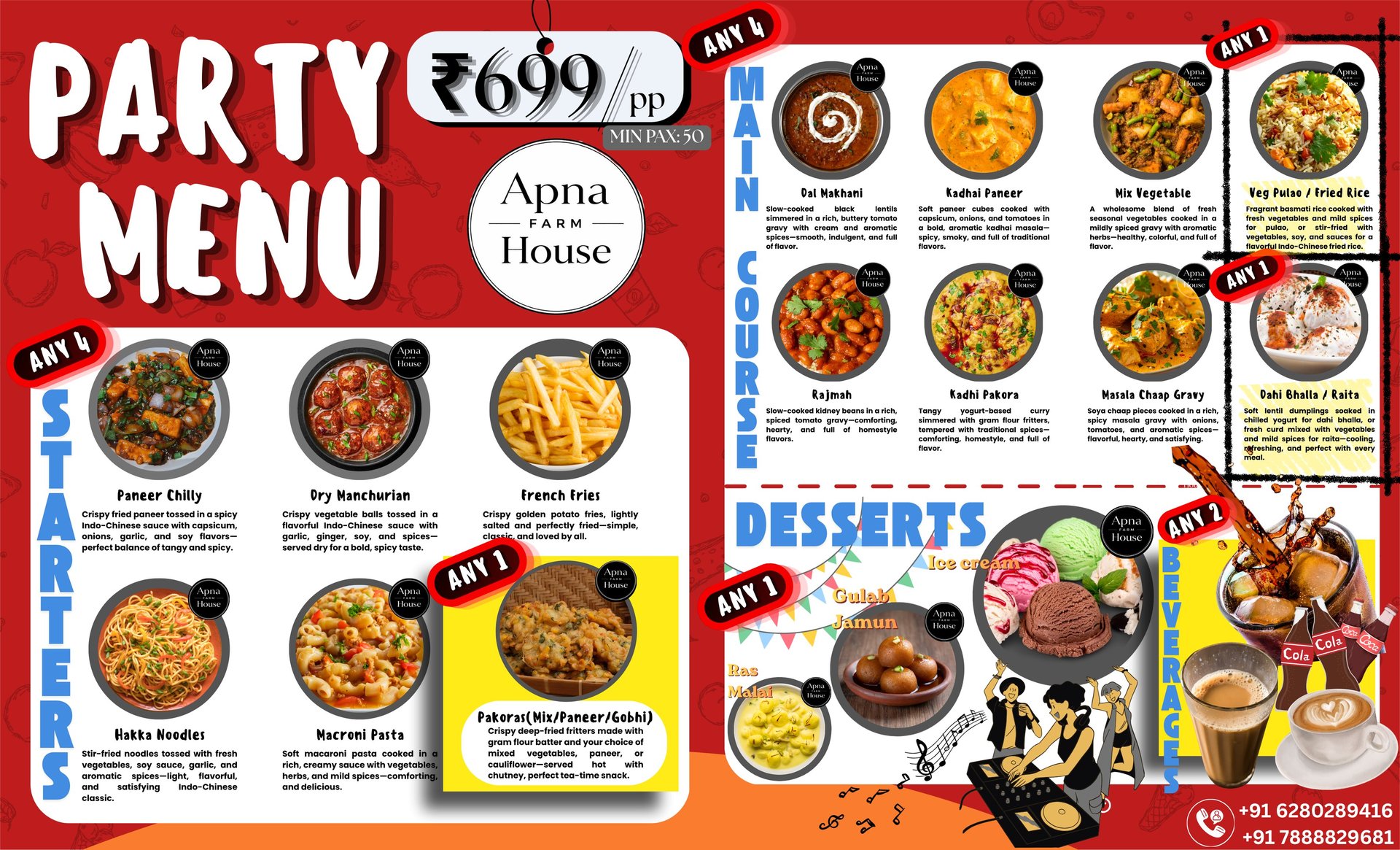 Apna Farm House is a vibrant all-in-one destination where great food meets open-air relaxation. Featuring a buffet, café, banquet space, and lush farm-style ambience, it’s designed for families, friends, and celebrations alike. Whether you're here for a casual meal or a special event, Apna Farm House offers a warm, desi yet modern experience at an affordable price.